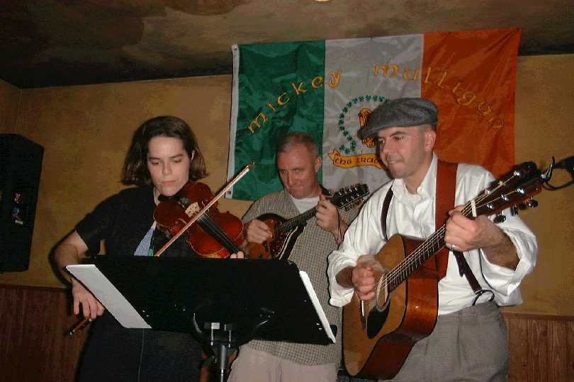 Colleen saws the fiddle with Mickey and Jack backing up her playing. |